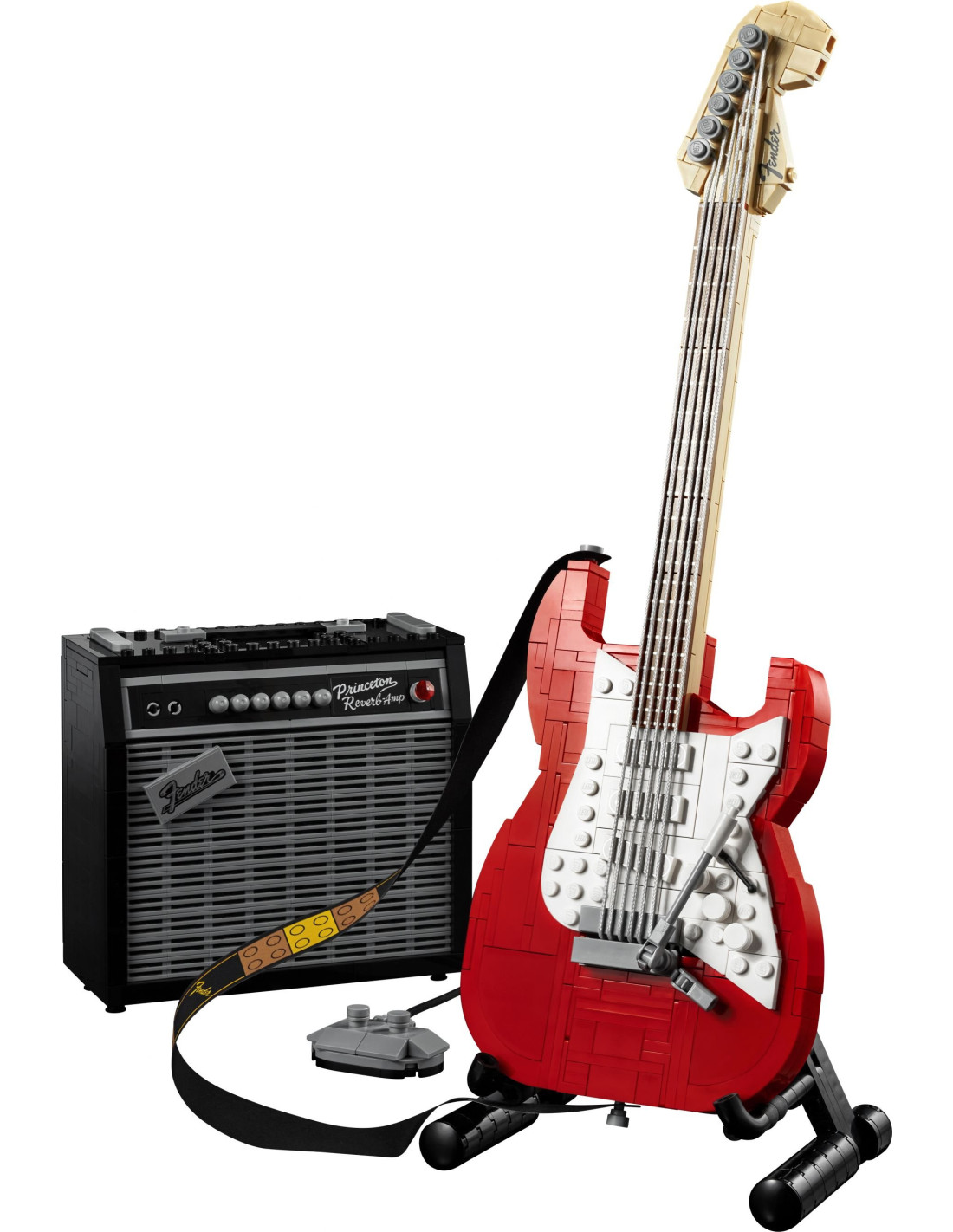 • There's also a collapsible guitar stand, scale model picks in 4 colors and a Fender® logo sticker made from LEGO® bricks that you can stick on your real guitar, amp or anywhere else.
