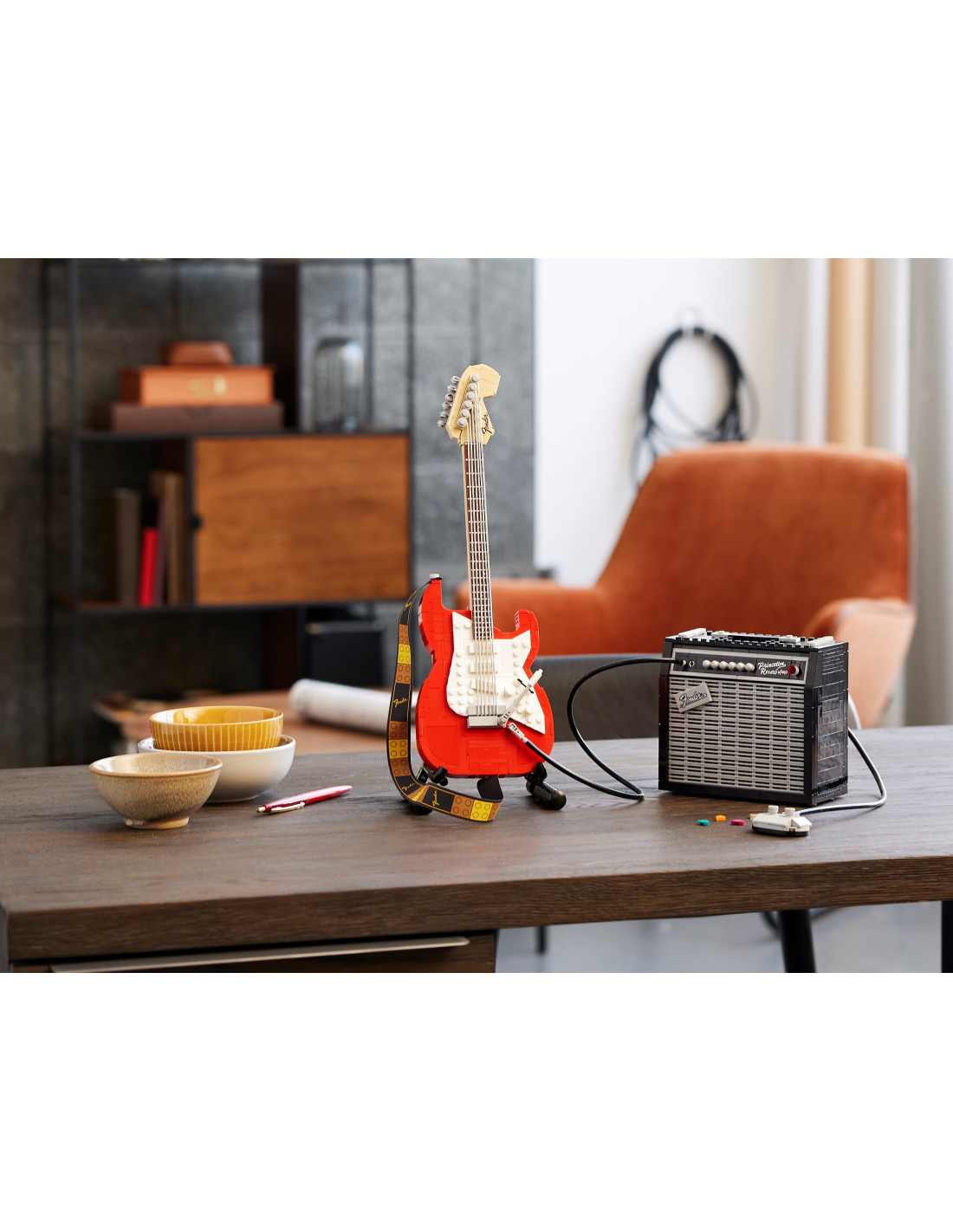 • The 1,079-piece set includes a booklet with Fender® Stratocaster® guitar history, fan and LEGO® designer information, and detailed building instructions.