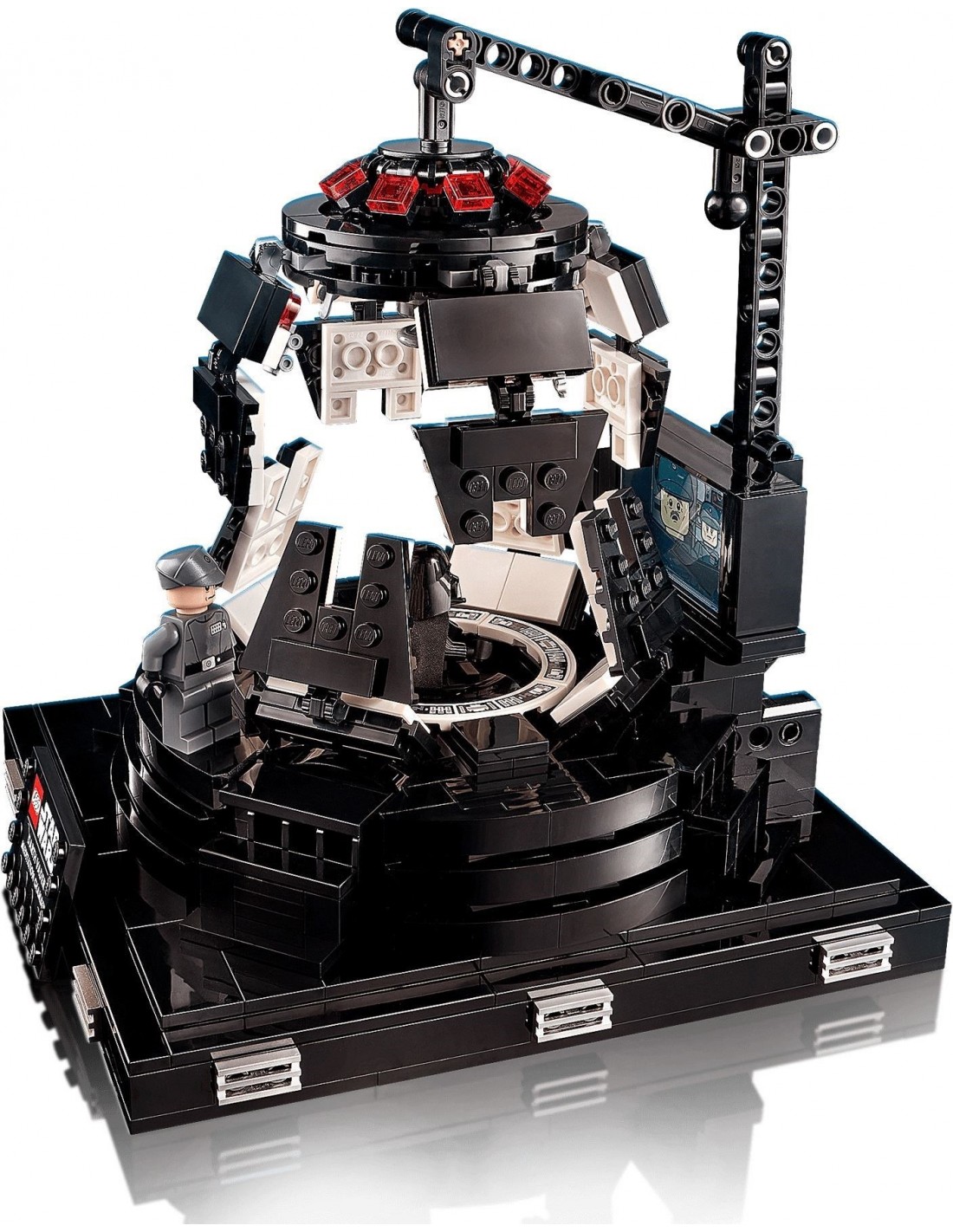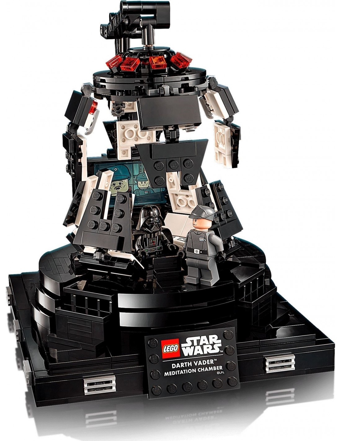 - The chamber opens and closes just like in the movie and features a swivel chair for Darth Vader, a large screen, control panels and a place for General Veers. The uniqueness of the model is illustrated by the information label.