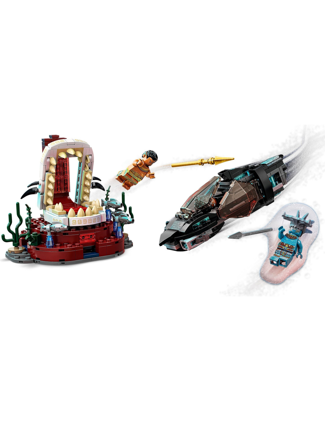 Elegantne štýlová replika ponorky Skirmisher z marvelovky Black Panther 2 je vyzbrojená vystreľovačmi, z ktorých môžu deti páliť po zloduchovi Attumovi. Na konci plavby ponorkou malí superhrdinovia objavia chrám kráľa Namora a trónnu sálu s výzdobou z chalúh a morských rias. Po dokončení výpravy môžu opäť nastúpiť na palubu ponorky a vyraziť v ústrety ďalšiemu podvodnému dobrodružstvu. Stavebnica obsahuje 3 minifigúrky postáv Shuri, Attumy a kráľa Namora s parádnymi zbraňami a doplnkami.
