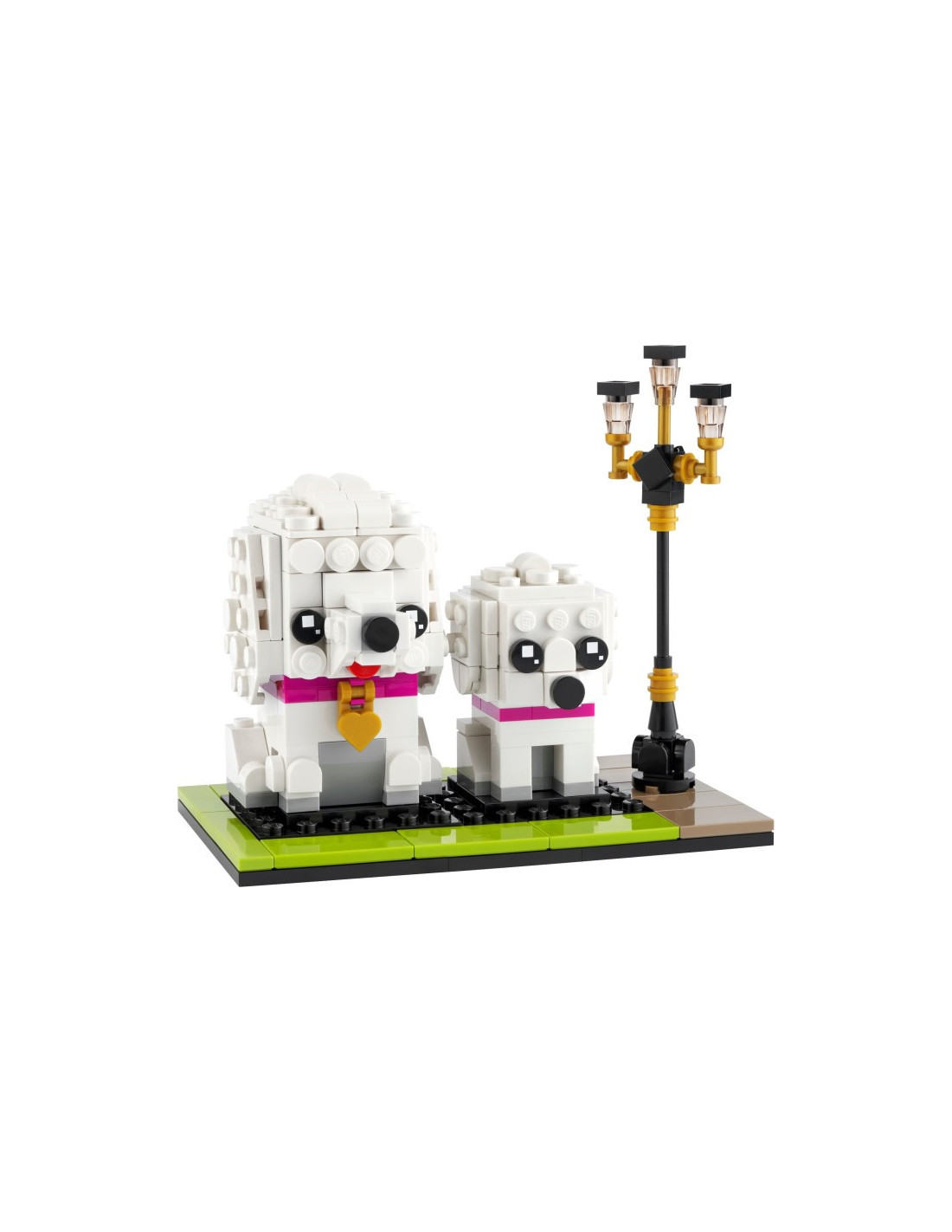 Urobte radosť malým milovníkom psov stavebnicou LEGO BrickHeadz™ Pudel (40546), ktorá je ideálna na výstavku. Psíky zdobí ružový obojok, dospelý pudel má navyše známku v tvare srdiečka, takže je ešte roztomilejší. Obaja chlpáči sedia na pevnej podložke a celú scénu dopĺňa retro pouličná lampa. Zostaviteľní miláčikovia predstavujú ideálny darček pre deti od 8 rokov a všetkých zberateľov BrickHeadz a milovníkov psov.